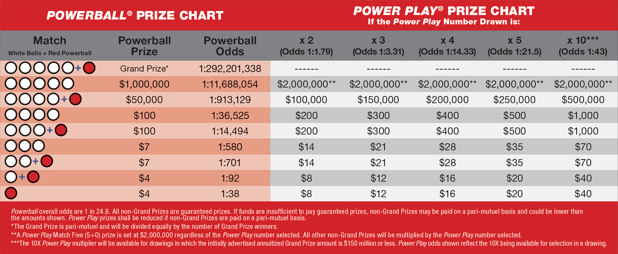 The Powerball jackpot grows until it is won. Players select five numbers from 1 to 69; and one Powerball number from 1 to 26. Players can multiply non-jackpot prizes by 2, 3, 4, 5 or 10 times with the Power Play® option for an additional $1 per play. NOTE: The Match 5 + Power Play prize is always $2 million. The 10X multiplier is only in play when the advertised jackpot is $150 million or less.